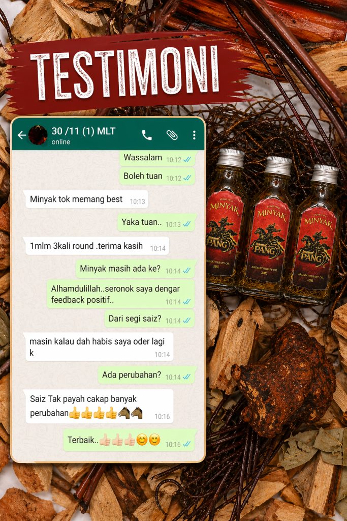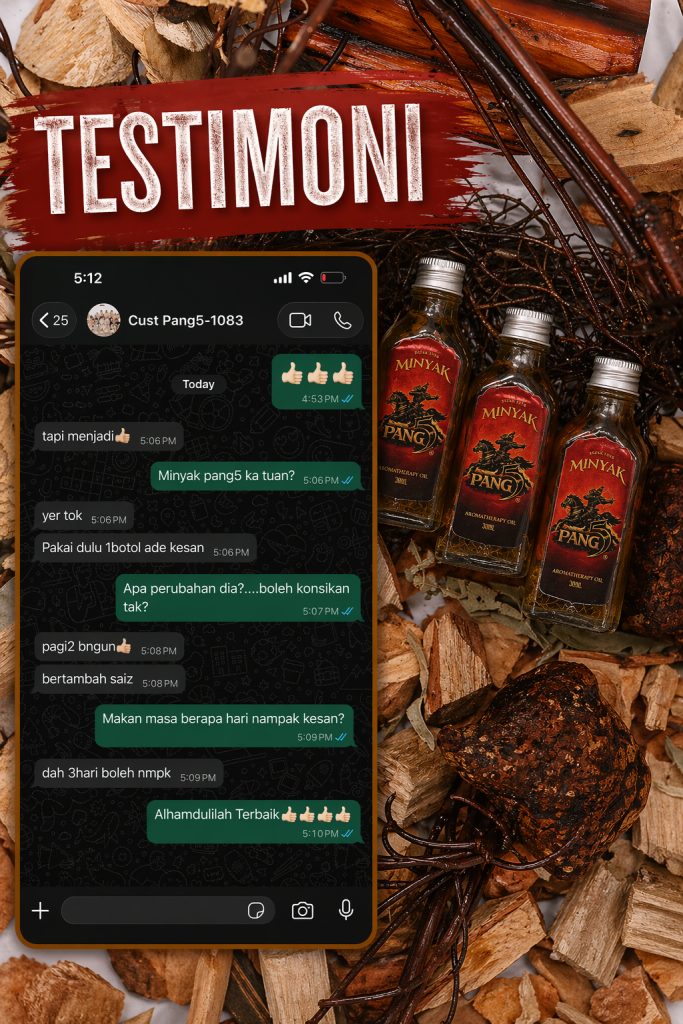PENAFIAN: Produk ini adalah minyak untuk kegunaan luaran sahaja. Bukan ubat dan tidak bertujuan untuk mendiagnosis, merawat, menyembuhkan atau mencegah sebarang penyakit. Keberkesanan penggunaan bergantung kepada kesesuaian individu dan pengalaman setiap pengguna mungkin berbeza. Gunakan mengikut arahan yang disyorkan. Hentikan penggunaan jika berlaku ketidakselesaan atau iritasi. Elakkan terkena mata, mulut, luka terbuka dan kawasan sensitif. Simpan di tempat kering serta jauh daripada capaian kanak-kanak. Jika mempunyai masalah kesihatan atau kulit sensitif, dapatkan nasihat profesional sebelum penggunaan.